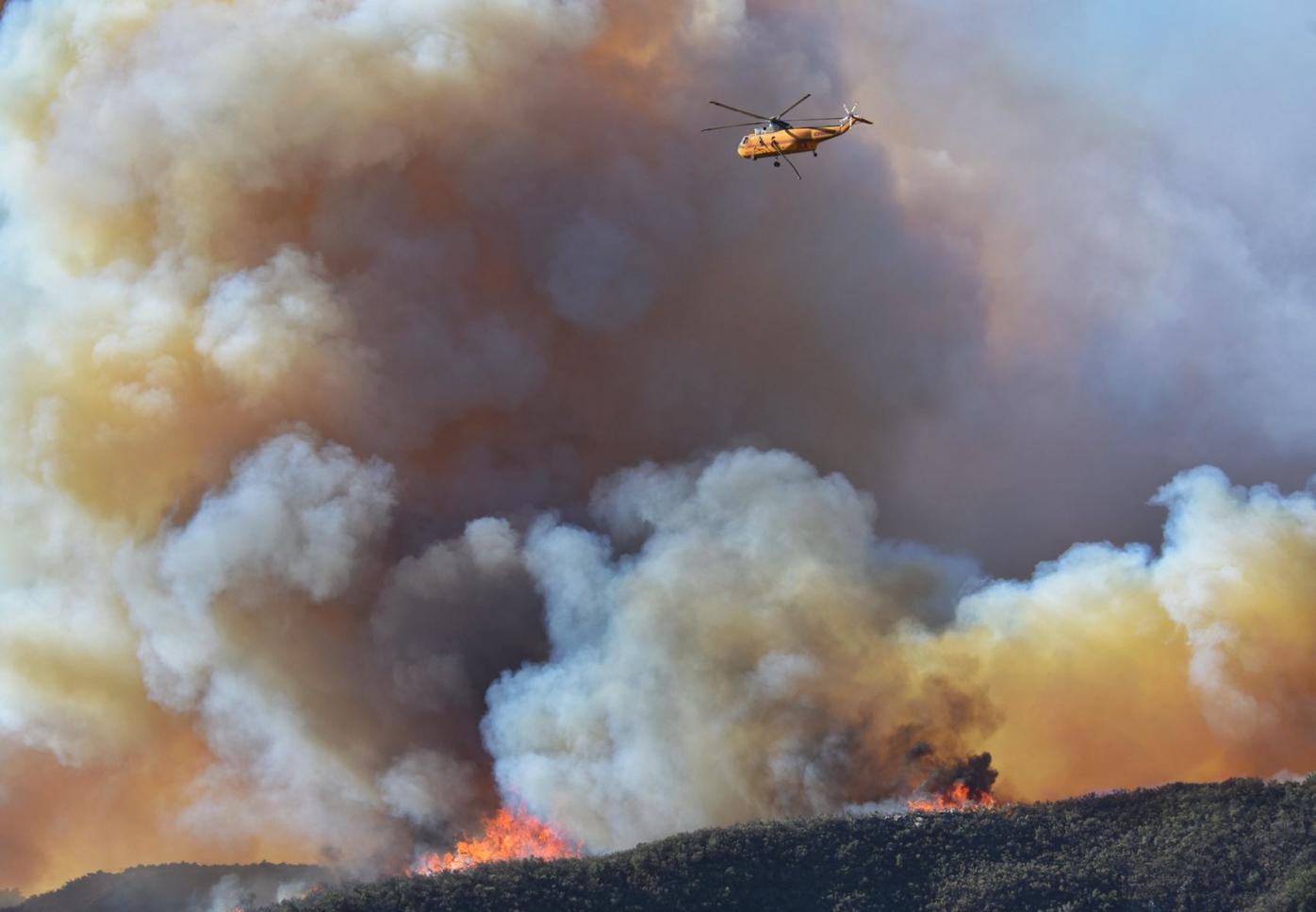 Sikorsky SH-3 heads back to refill its tank. Shortly before 6 pm authorities were estimating the fire had grown to more than 1000 acres said Andrew Madsen a spokesman for the National Forest. Fire is approaching the freeway.